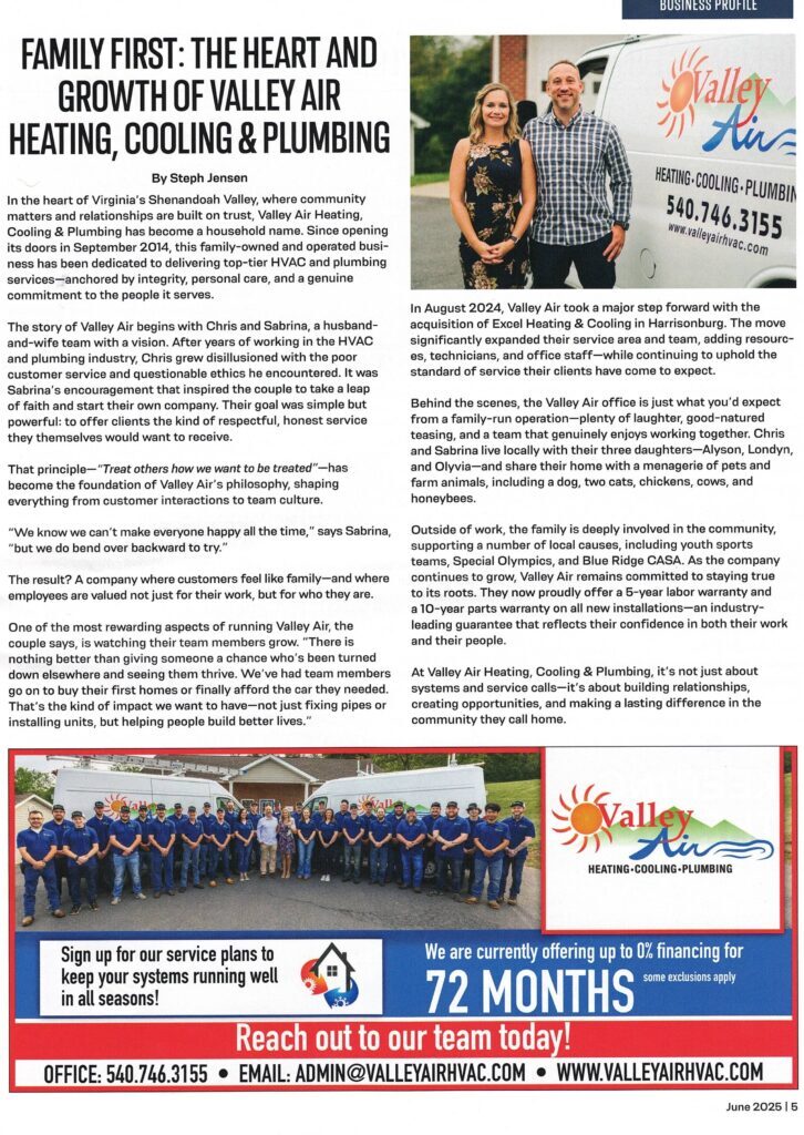 Valley Air Heating, Cooling & Plumbing is a family-owned and operated HVAC company that proudly serves the Shenandoah Valley with the best service for all of your heating, cooling, and plumbing needs. We’re firmly committed to helping our neighbors and improving our community as much as we possibly can. That’s why we support several local sports teams, the Special Olympics, Project Grows, and Habitat for Humanity. Our experienced HVAC contractors repair and install all makes and all models of heating & cooling systems. Whether it’s in your home or business, we can get the job done. Here at Valley Air Heating, Cooling & Plumbing we strive for excellence in customer satisfaction. Our guarantee is prompt, reliable service offering you the best solution at the most affordable price. We are equipped to handle any size request for residential and light commercial systems. Our team of specialists are always available to answer any questions you have and provide you with the information you need to make an educated decision.